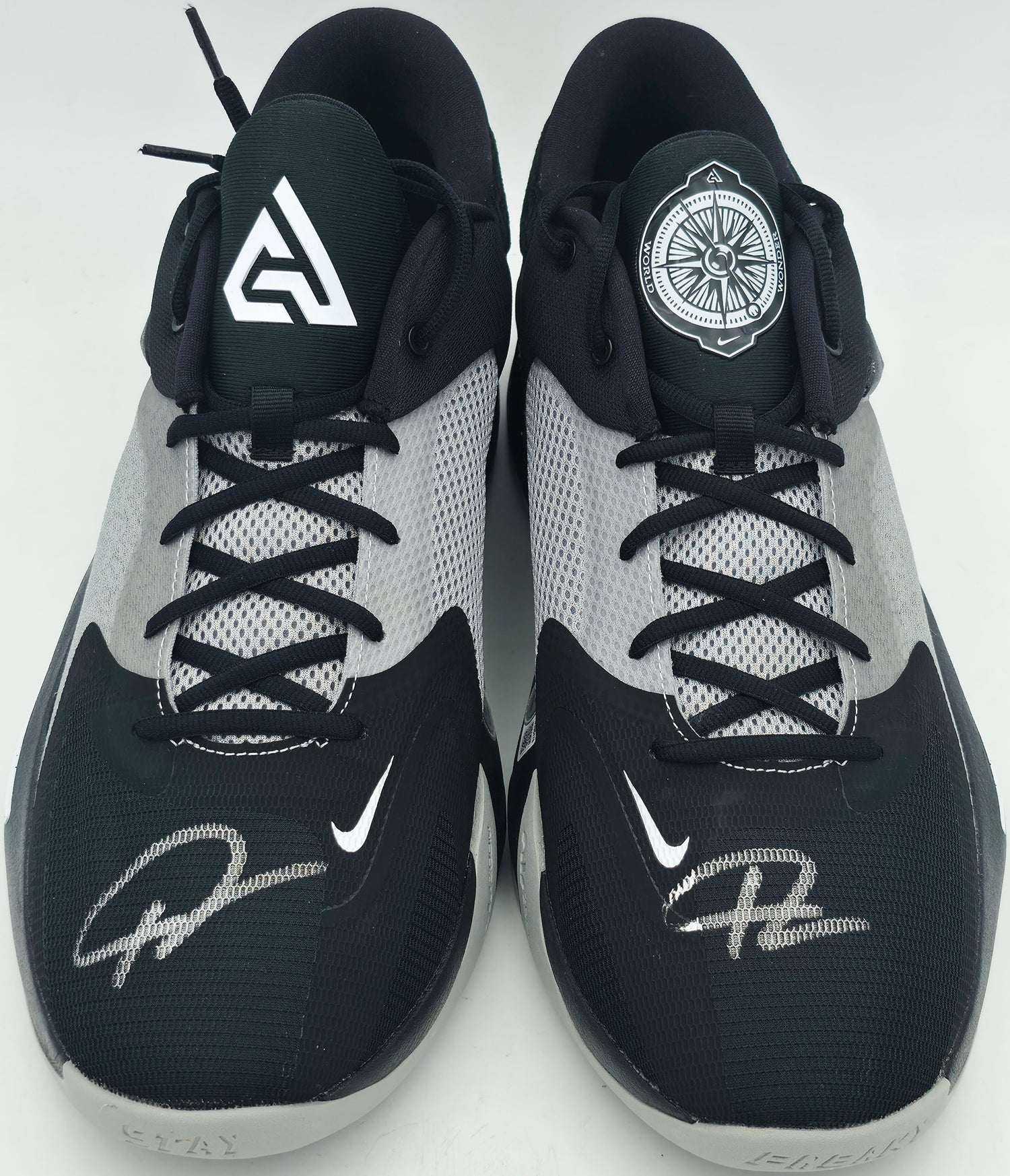 Own a rare piece of NBA history with this hand-signed pair of Nike Zoom Freak 4 Shoes, autographed by Giannis Antetokounmpo—one of the most dominant players of his generation. These Black/Grey/White sneakers are size 16, matching Giannis Antetokounmpo’s shoe size during the early years of his NBA career. Whether you're investing in a signature moment from the Milwaukee Bucks superstar or expanding your collection of authentic basketball memorabilia, these signed shoes are a slam dunk for serious collectors.