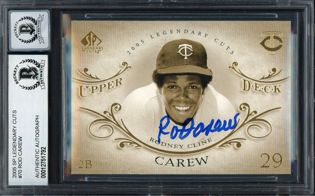 Own a piece of baseball history with this 2005 SP Legendary Cuts Card #70, hand-signed by Hall of Famer Rod Carew. This rare collectible has been authenticated and encapsulated by Beckett Authentication Services (BAS), ensuring its genuine value for serious collectors and baseball enthusiasts.
