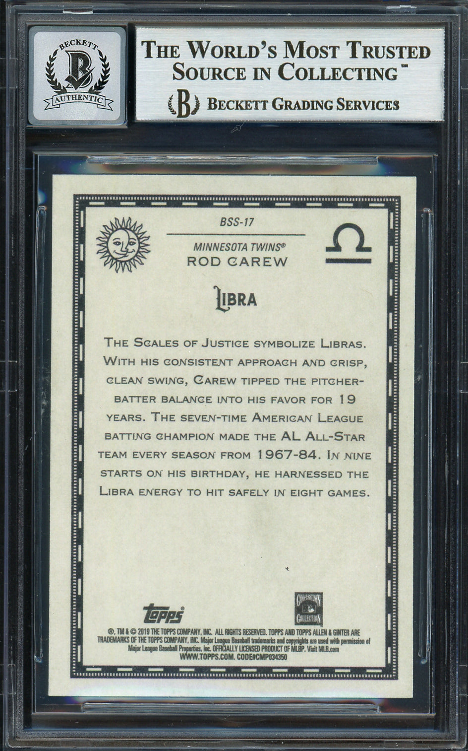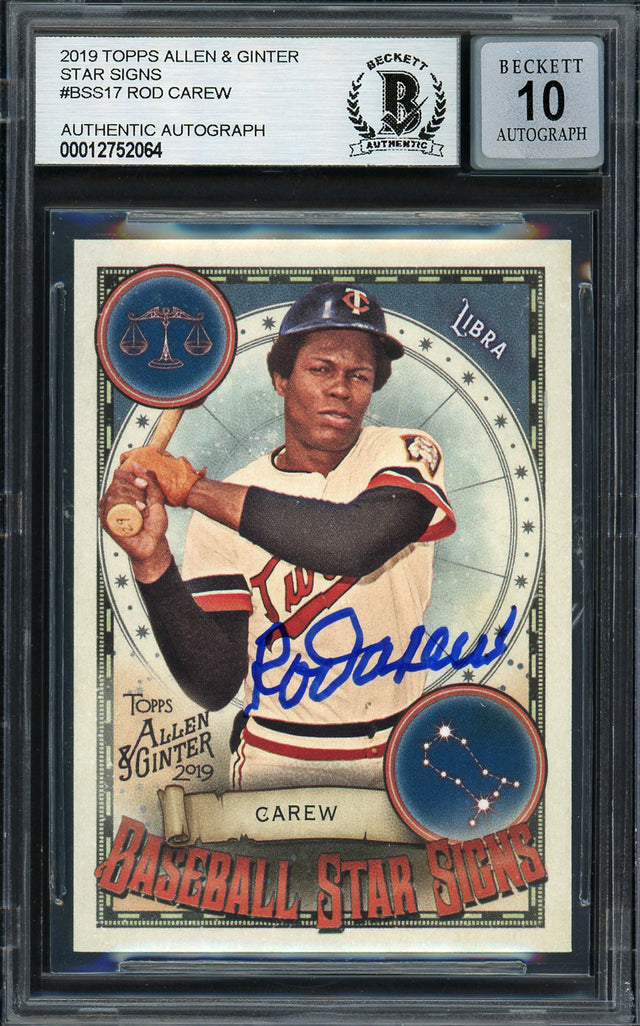 Rod Carew Autographed 2019 Topps Allen & Ginter Baseball Star Signs Card #BSS-17 Minnesota Twins Auto Grade Gem Mint 10 Beckett BAS Stock #192833