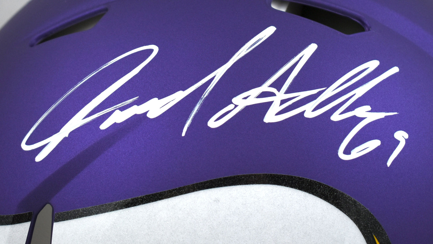 Own a piece of Minnesota Vikings history with this Jared Allen hand-signed Riddell full-size Speed Authentic football helmet. A fan-favorite defensive end and Vikings legend, Allen was known for his relentless pass-rushing ability and signature sack celebrations. This autographed helmet is a must-have for any true Vikings collector or NFL memorabilia enthusiast.