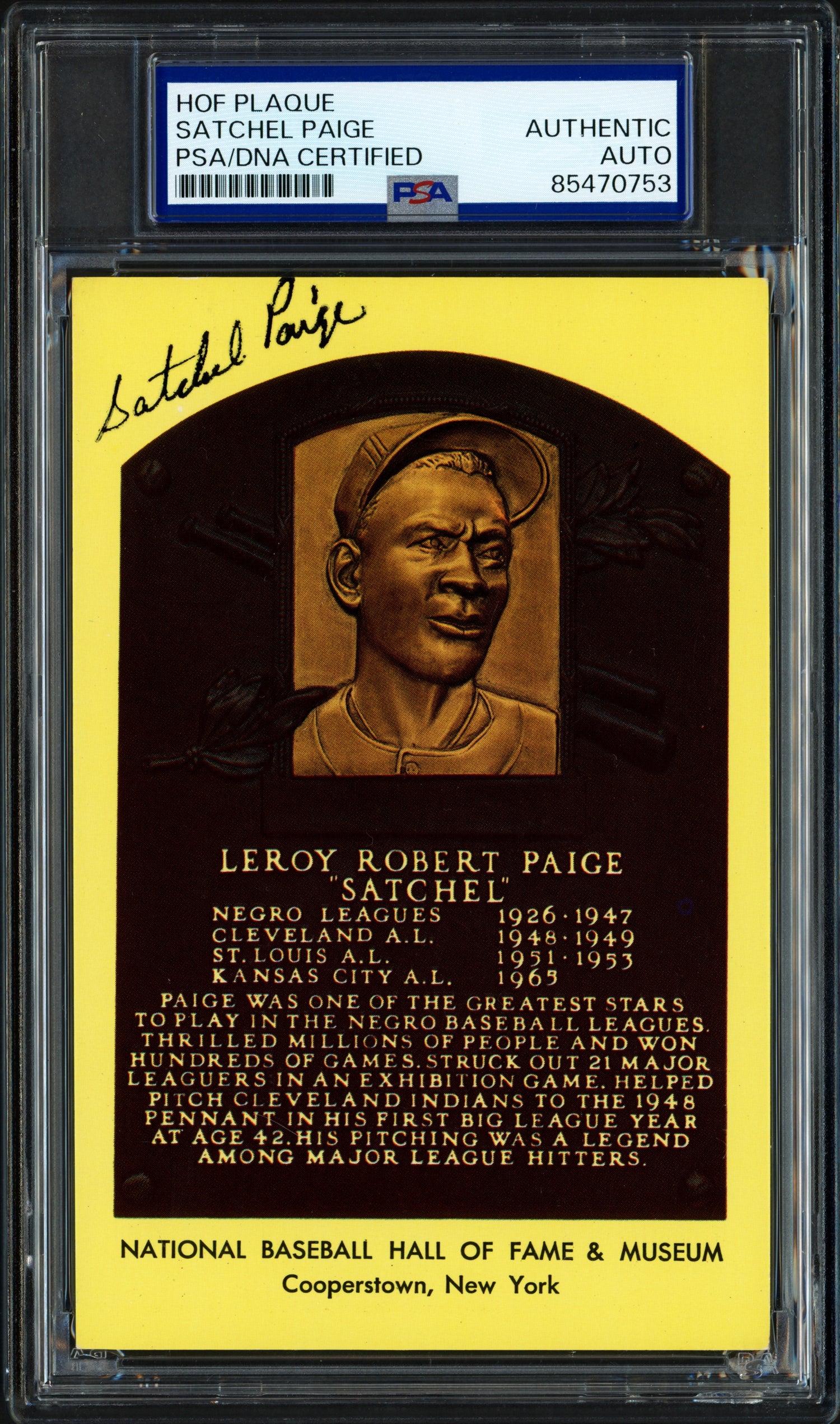 Satchel Paige Autographed Hall of Fame HOF Plaque Postcard Negro Leagues PSA/DNA #85470753