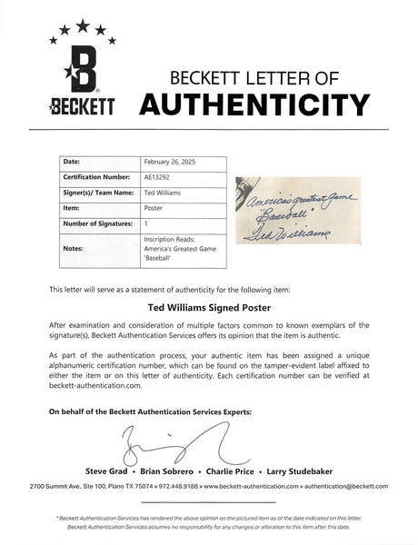 Ted Williams "America's Greatest Game" Signed 17.5x22 Lithograph BAS #AE13292