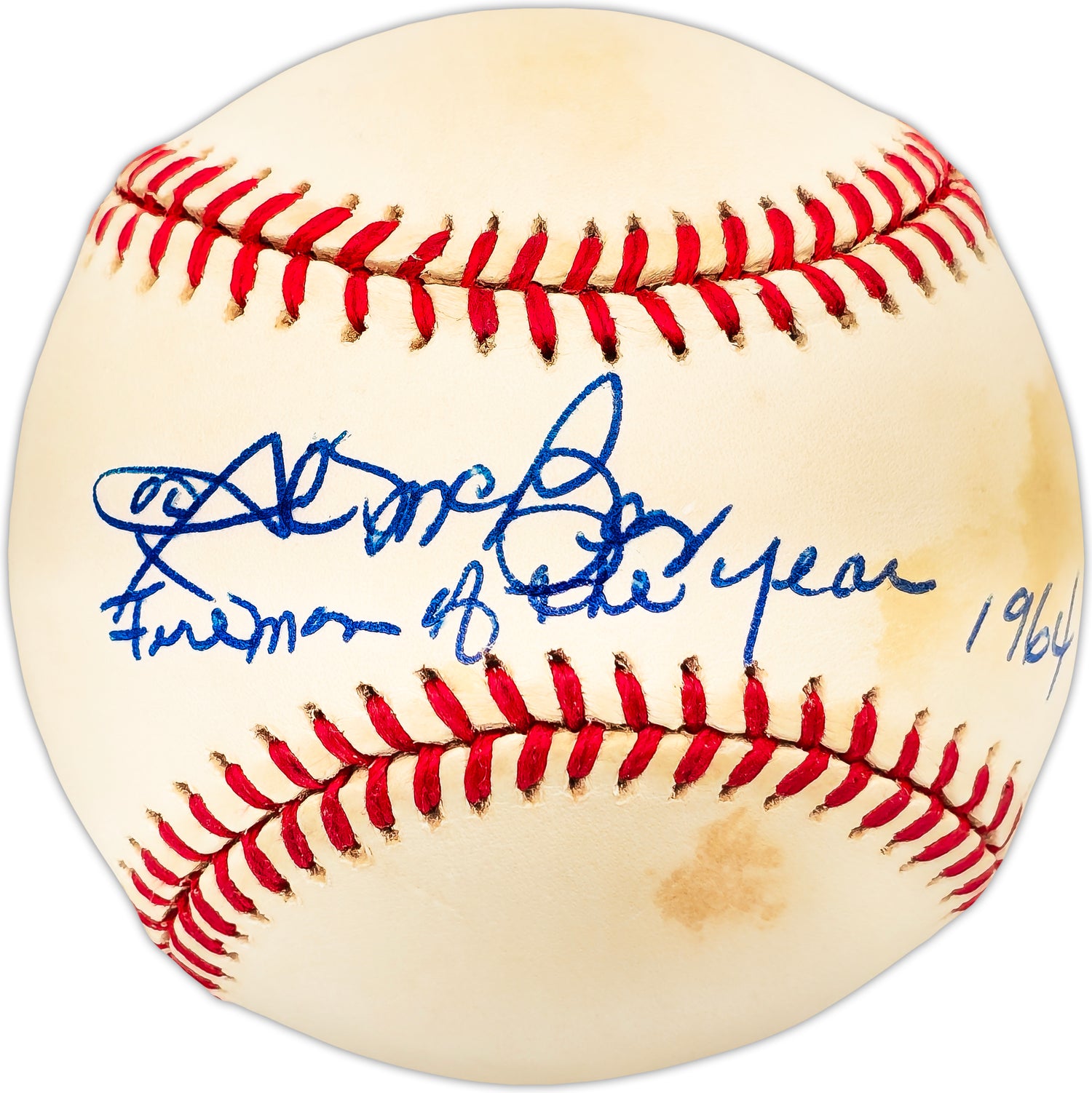 This Official National League Baseball has been hand-signed by Al McBean, the standout relief pitcher known for his role with the Pittsburgh Pirates. This exclusive collectible features the rare inscription "Fireman of the Year 1964," commemorating McBean's recognition as the league’s top relief pitcher that year.