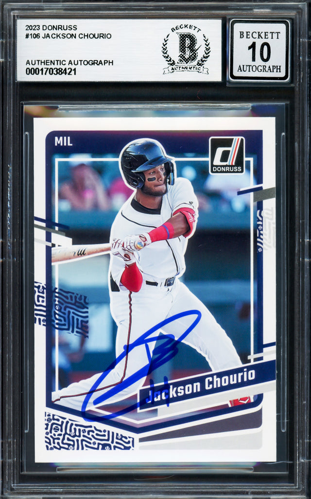 Jackson Chourio Autographed 2023 Donruss Rookie Card #106 Milwaukee Brewers Auto Grade Gem Mint 10 Beckett BAS Stock #233958