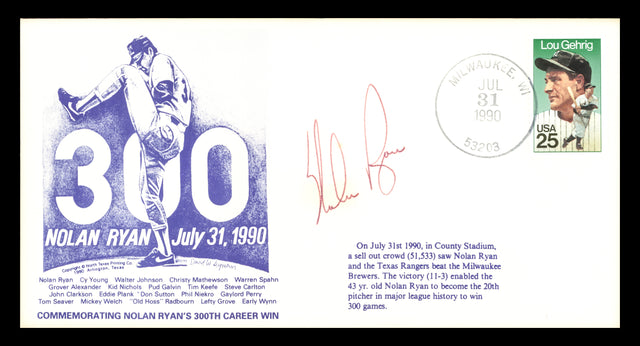 This collectible First Day Cover, measuring approximately 4x7.5 inches, has been authentically hand-signed by Hall of Fame pitcher Nolan Ryan, adding true value and prestige to any memorabilia collection. A legendary figure in Major League Baseball, Nolan Ryan's career spanned an unmatched 27 seasons, during which he set records that may never be broken—including an all-time high of 5,714 strikeouts and seven no-hitters. This piece celebrates Ryan’s iconic legacy and is ideal for baseball fans, sports historians, and serious memorabilia collectors alike. Whether you’re a fan of the New York Mets, California Angels, Houston Astros, or Texas Rangers—teams Ryan played for—this item represents a career that defined power pitching and longevity.