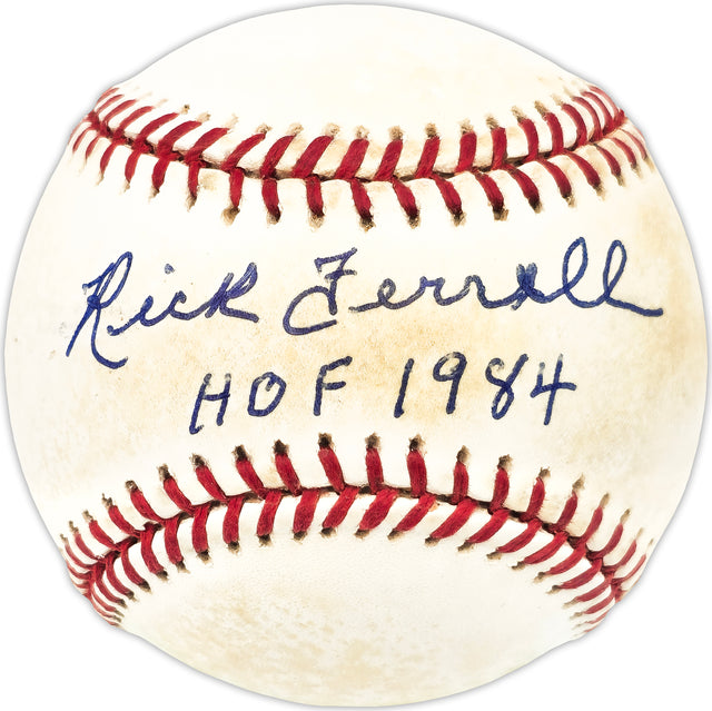 This Official American League Baseball has been hand-signed by Hall of Famer Rick Ferrell and inscribed with "HOF 1984." A treasured piece for serious collectors, this autographed baseball honors one of baseball’s legendary catchers, known for his stellar career spanning the 1920s to the 1940s.