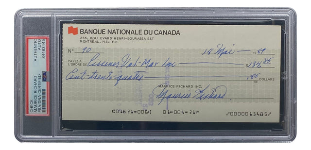 Own a rare piece of hockey history with this Maurice Richard signed Montreal Canadiens bank check! Hand-signed by the legendary "Rocket" Richard, this authenticated check is a must-have for any serious collector or devoted Habs fan. Encapsulated and certified by PSA/DNA, this unique item preserves the legacy of one of the greatest goal scorers in NHL history.