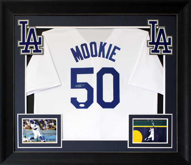 Autographed, signed memorabilia with display-ready appeal: Mookie Betts white pro style framed jersey—JSA authenticated. A two-time World Series champion (2018 with Boston; 2020 with Los Angeles) and the 2018 American League MVP, Betts is a perennial All-Star with multiple Gold Gloves and Silver Sluggers. This is a fan-grade centerpiece for any Dodgers collection.