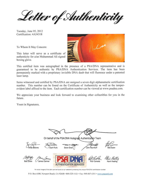 A Muhammad Ali signed glove is among the most prized items in all of sports memorabilia. We carry 15 authenticated signed boxing gloves, each verified by industry-leading authenticators including PSA, JSA, and Beckett. Every glove ships with a Certificate of Authenticity and tamper-evident hologram.