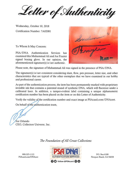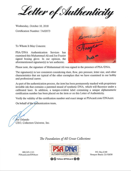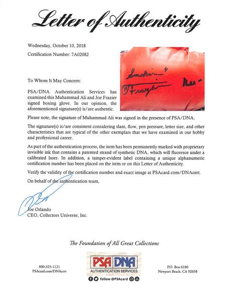 Very low stock (1 unit)$3,829Unit price /UnavailableMuhammad Ali & Joe Frazier Signed Red Everlast Boxing Glove PSA/DNA #7A02078
