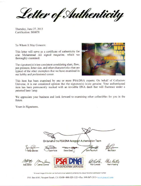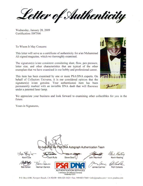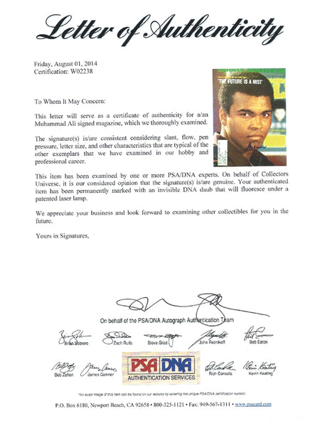 Every Muhammad Ali autograph sold at Pristine Marketplace is backed by our authentication guarantee. We partner with PSA, JSA, Beckett, and other trusted authenticators to verify every signature. Each purchase includes a Certificate of Authenticity and is protected by our 60-day return policy for any reason.