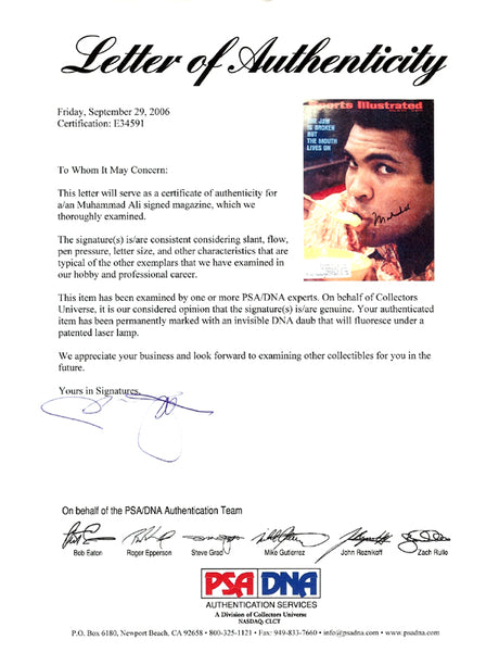 Very low stock (1 unit)$1,079Unit price /UnavailableMuhammad Ali Autographed Sports Illustrated Magazine Cover "Oct 4-81" PSA/DNA #S01615