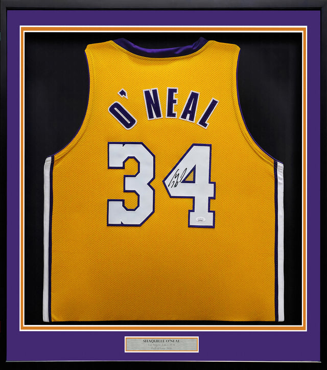 Celebrate basketball greatness with this striking framed gold jersey hand-signed by Shaquille O'Neal, one of the most dominant centers in NBA history. Measuring approximately 31x36 inches with the frame, this show-stopping display piece brings a bold presence to any sports memorabilia collection. This is a custom jersey (no brand name) in approximate XL size, designed with high-quality sewn-in name and numbers, echoing the grandeur of Shaq’s legendary career. To ensure authenticity and peace of mind for collectors, this item is JSA certified and includes their tamper-proof hologram for verification.