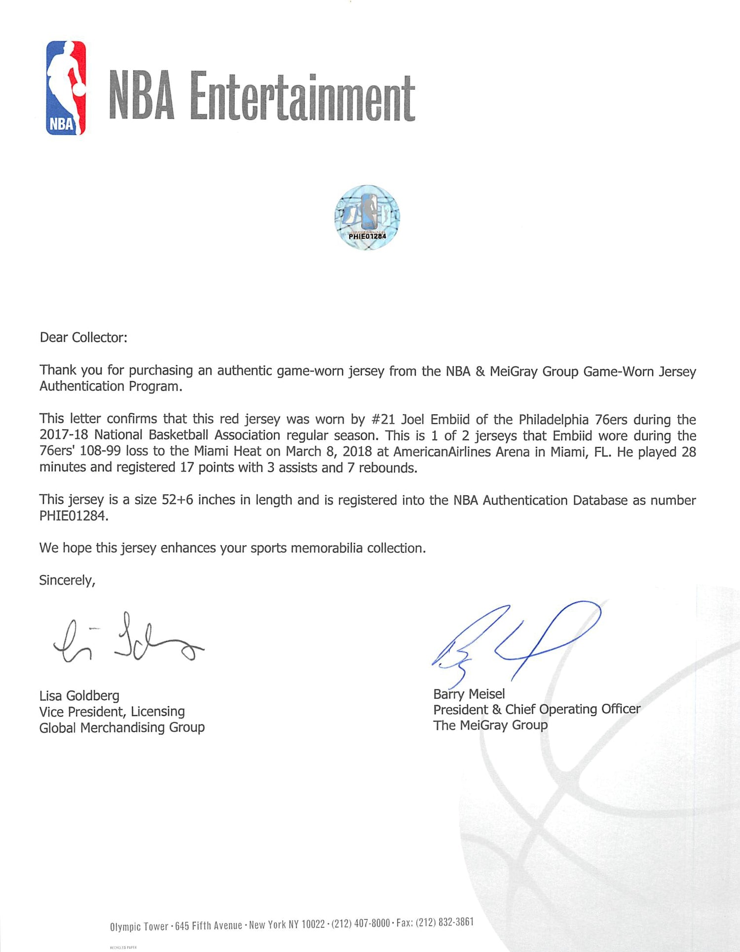- Game-Worn Authenticity – Worn by Joel Embiid during the March 8, 2018 game vs. Miami, showcasing appropriate use.