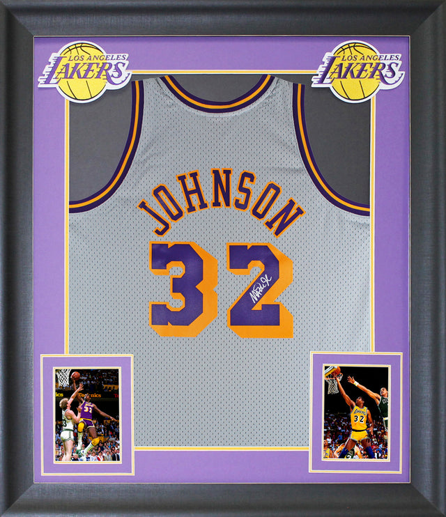 Lakers Magic Johnson Signed Grey M&N HWC Swingman Framed Jersey BAS Witnessed