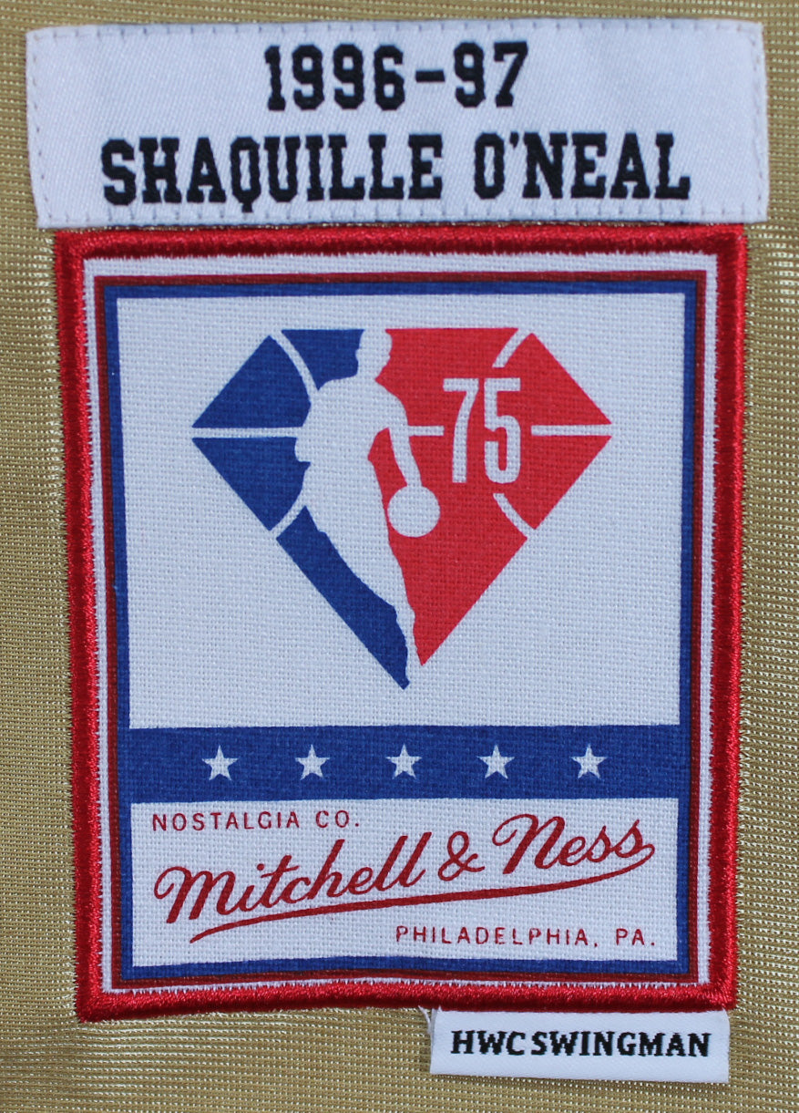 - Mitchell & Ness 1996-97 75th Anniversary Hardwood Classics Swingman Jersey in gold, honoring Shaq’s dominant years with the Los Angeles Lakers.