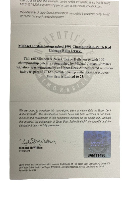 Michael Jordan Autographed Chicago Bulls Framed Red Mitchell & Ness Authentic Jersey with 1991 NBA Finals Patch LE 5/23 UDA is backordered and will ship as soon as it is back in stock.