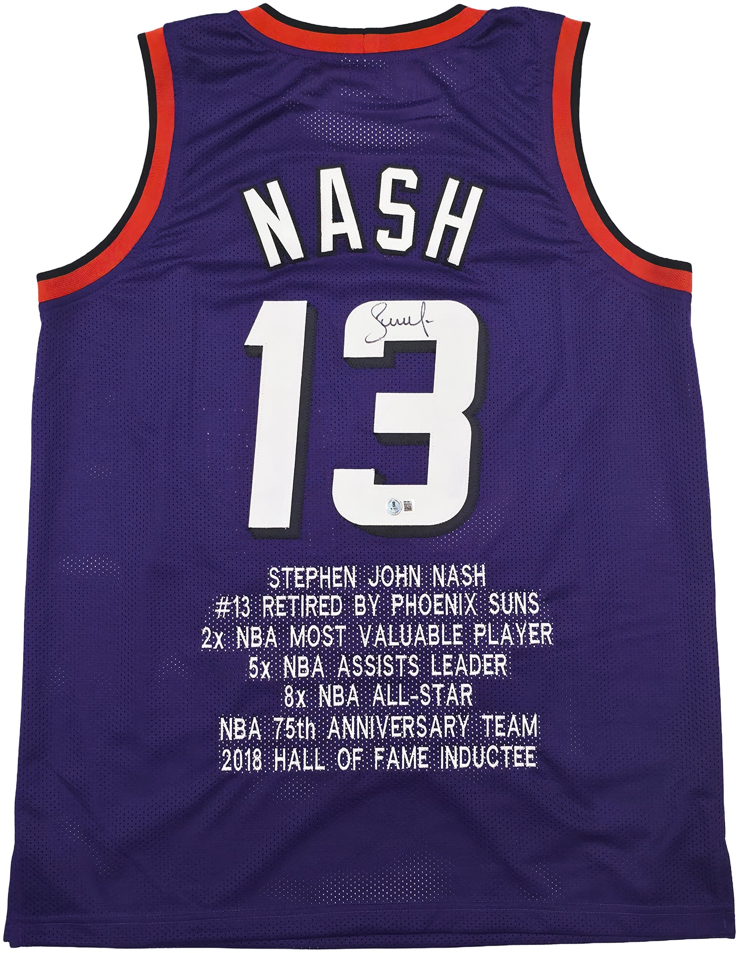 Celebrate one of basketball’s greatest point guards with this hand-signed Steve Nash Purple Stat Jersey—a must-have collectible for dedicated NBA fans and memorabilia collectors alike. This custom jersey honors Steve Nash, legendary for his time with the Phoenix Suns and a two-time NBA MVP, known for his unmatched court vision and leadership. Whether you're a lifelong fan of Nash’s playmaking brilliance or building out your premium autograph collection, this autographed jersey makes a standout display piece backed by leading authentication.