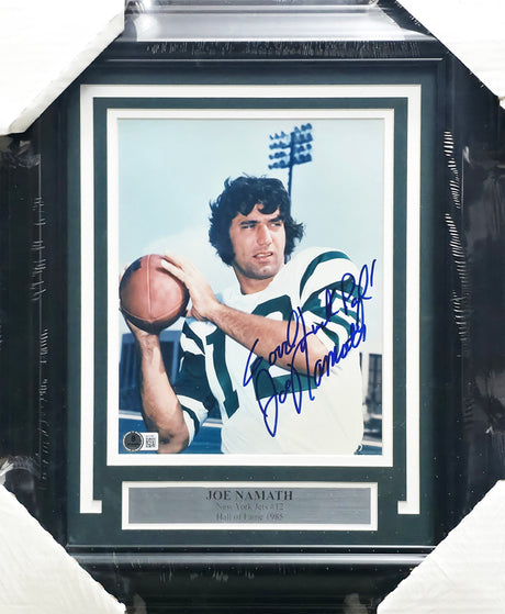 Low stock (4 units)$129Unit price /Unavailable Joe Namath Autographed Framed 8x10 Photo New York Jets "Good Luck Pal!" Beckett BAS QR #AE31689