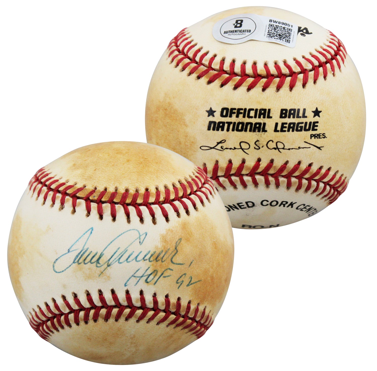 - Item: Official National League (Leonard S. Coleman) baseball, hand-signed with “HOF 92” inscription; BAS hologram/QR; BAS #BW89051; natural toning from age