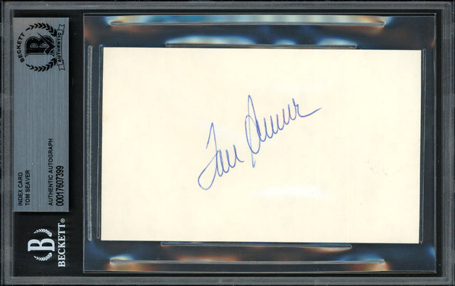 This 3x5 Index Card has been hand-signed by legendary pitcher Tom Seaver, one of the most dominant arms in Major League Baseball history. A cornerstone of the New York Mets’ success, Seaver was instrumental in their 1969 World Series Championship run, earning him the nickname "Tom Terrific." Authenticated by Beckett Authentication Services (BAS), this signed index card is encapsulated in BAS's tamper-proof holder, ensuring its authenticity and long-term preservation. A must-have for serious baseball collectors and Mets fans alike, this piece pays homage to Seaver’s Hall of Fame career and lasting legacy in the sport. Product Features: