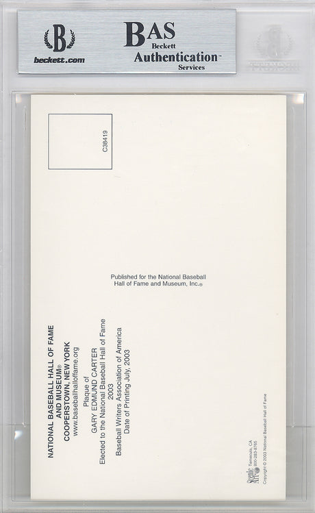 Gary Carter Autographed HOF Plaque Postcard Expos, Mets "HOF 03" Beckett BAS STOCK #128122