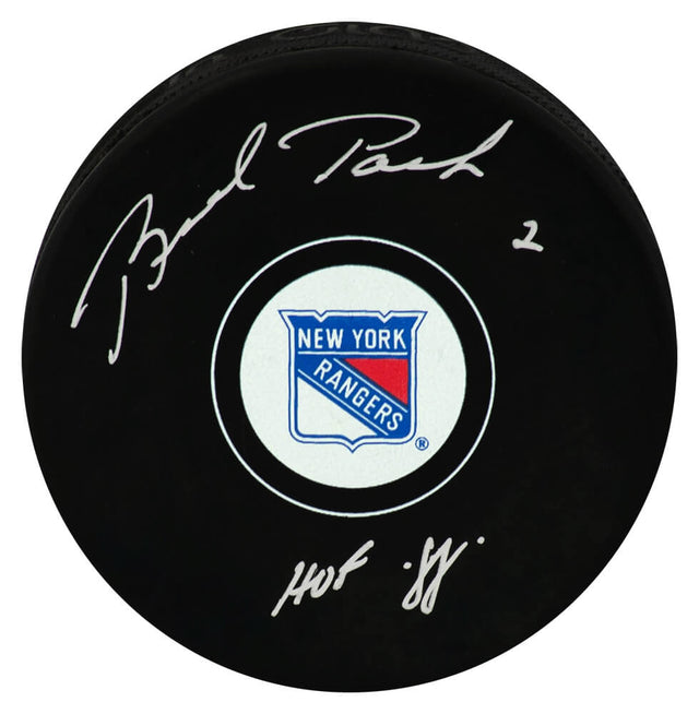This officially licensed Brad Park signed New York Rangers logo hockey puck is a must-have collectible for serious hockey fans and memorabilia collectors. Featuring the bold, classic Rangers logo and personally autographed by legendary defenseman Brad Park, this puck includes the rare inscription "HOF 88", honoring his 1988 induction into the Hockey Hall of Fame. A cornerstone of the New York Rangers during the 1970s, Park was known for his elite two-way play and leadership on the ice, making this piece a tribute to a golden era in Rangers history.