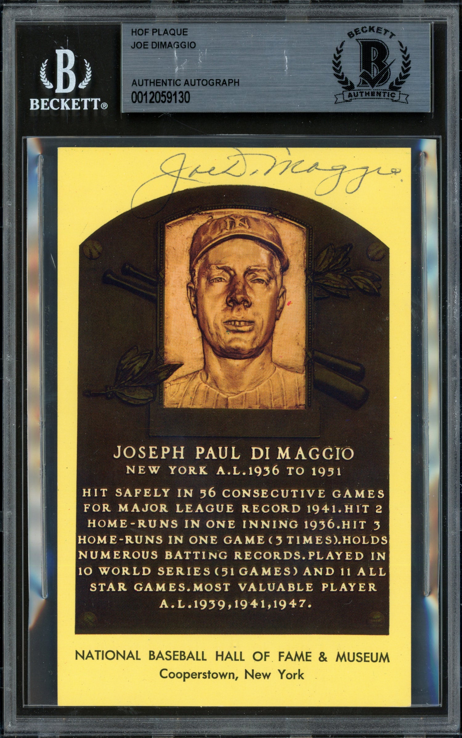Joe DiMaggio Autographed Hall of Fame HOF Plaque Postcard New York Yankees Beckett BAS #12059130