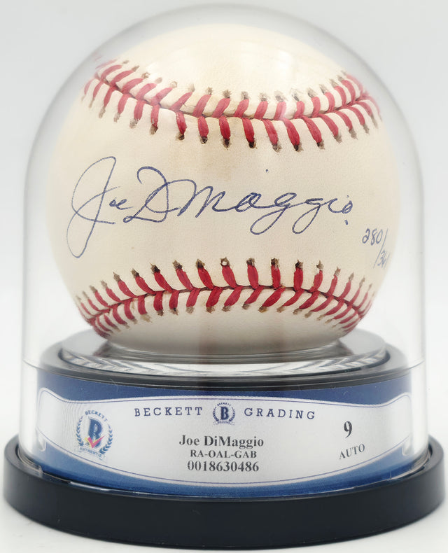 Joe DiMaggio Autographed Official AL Baseball New York Yankees Auto Grade Mint 9 #280/361 Beckett BAS #18630486 is backordered and will ship as soon as it is back in stock.