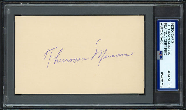 This collectible 3x5 index card has been hand-signed by Thurman Munson, the legendary New York Yankees catcher and 1976 American League MVP. Known for his gritty leadership and clutch performances during the Yankees' dominant era in the 1970s, Munson remains an iconic figure in baseball history. This signature has been professionally authenticated and graded by PSA/DNA, earning a perfect Gem Mint 10, a testament to its exceptional quality and bold presentation. A must-add for serious collectors and Yankees fans alike, this piece captures a rare piece of Bronx Bomber legacy. It comes encapsulated in PSA/DNA’s tamper-proof holder to ensure long-term preservation and authenticity.