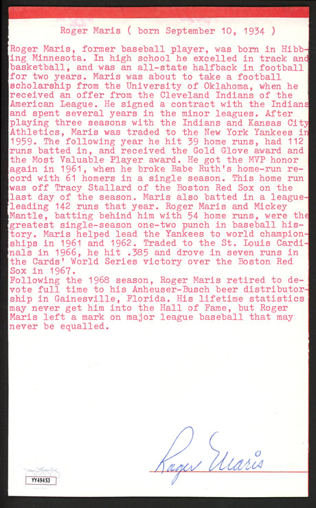 Very low stock (1 unit)$389Unit price /UnavailableRoger Maris Autographed 5.5x8.5 Cut Signature New York Yankees Biography JSA #YY49453