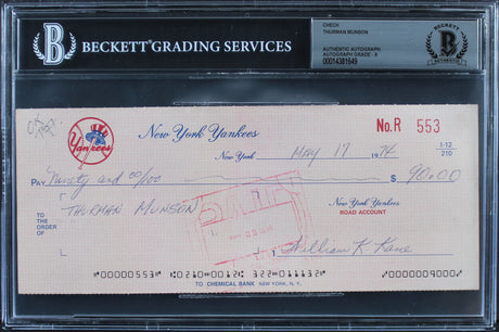 Yankees Thurman Munson Authentic Signed 3.5x8.5 1974 NNY Check Auto 9! BAS Slab