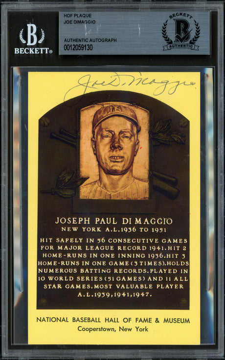Joe DiMaggio Autographed Hall of Fame HOF Plaque Postcard New York Yankees Beckett BAS #12059133