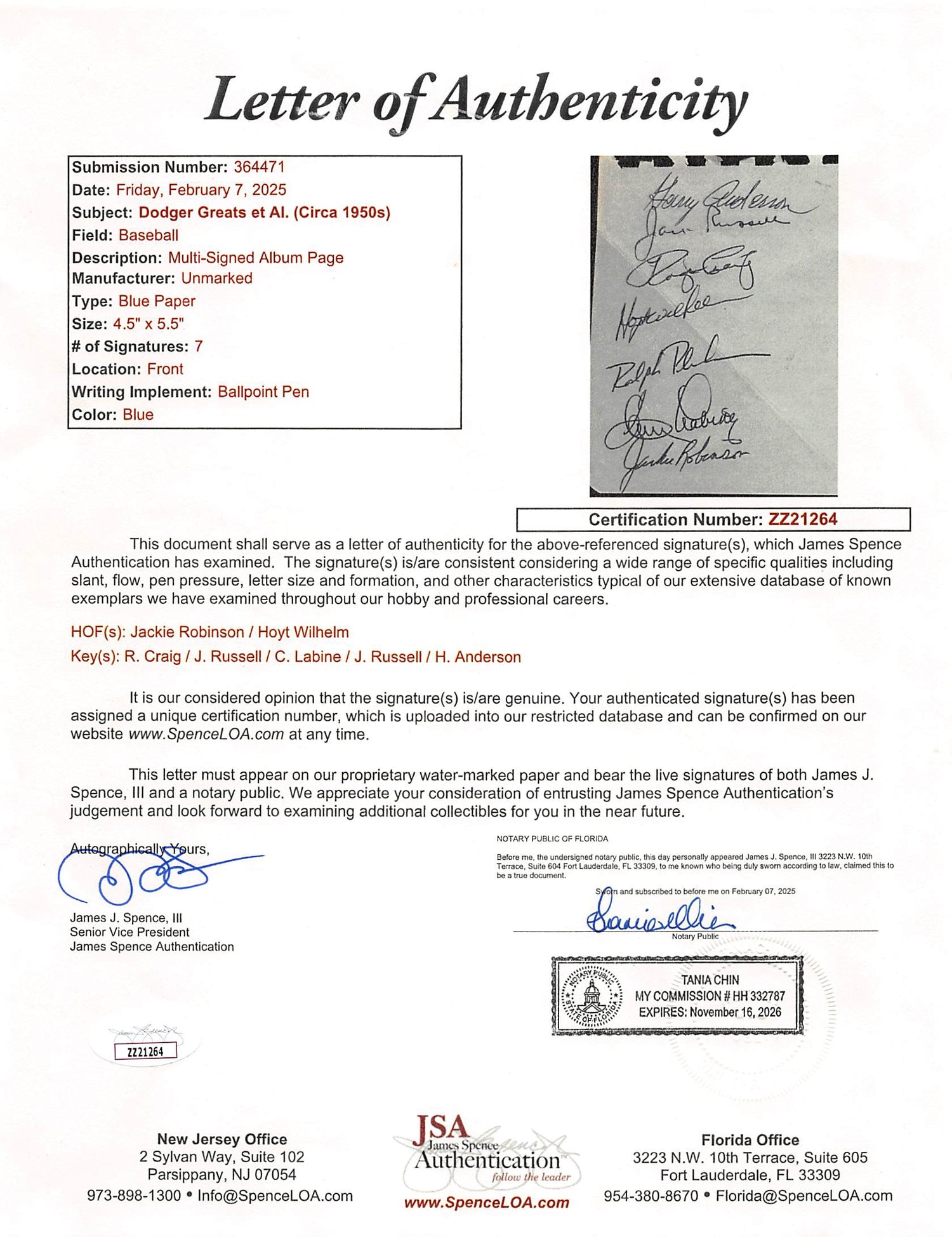 - Personally hand-signed by Jackie Robinson, Hoyt Wilhelm, Clem Labine, Jim Russell, Roger Craig, Harry Anderson & Ralph Plumlee of the Los Angeles Dodgers