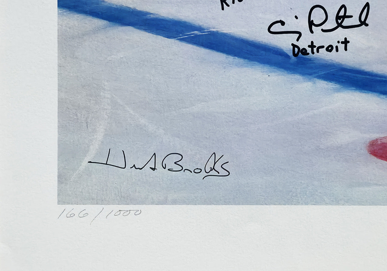 Relive one of the most iconic moments in sports history with this stunning, Framed 26x32 Lithograph Photo (approx. 33x41 with frame) signed by members of the legendary 1980 Team USA Hockey Team. Immortalized with the famous phrase "Do You Believe In Miracles?!", this collector’s centerpiece celebrates the underdog U.S. victory over the Soviet Union in the "Miracle on Ice" at the 1980 Winter Olympics in Lake Placid. A must-have for serious collectors, hockey fans, and American sports history enthusiasts alike, this piece is steeped in historic value and authenticity.