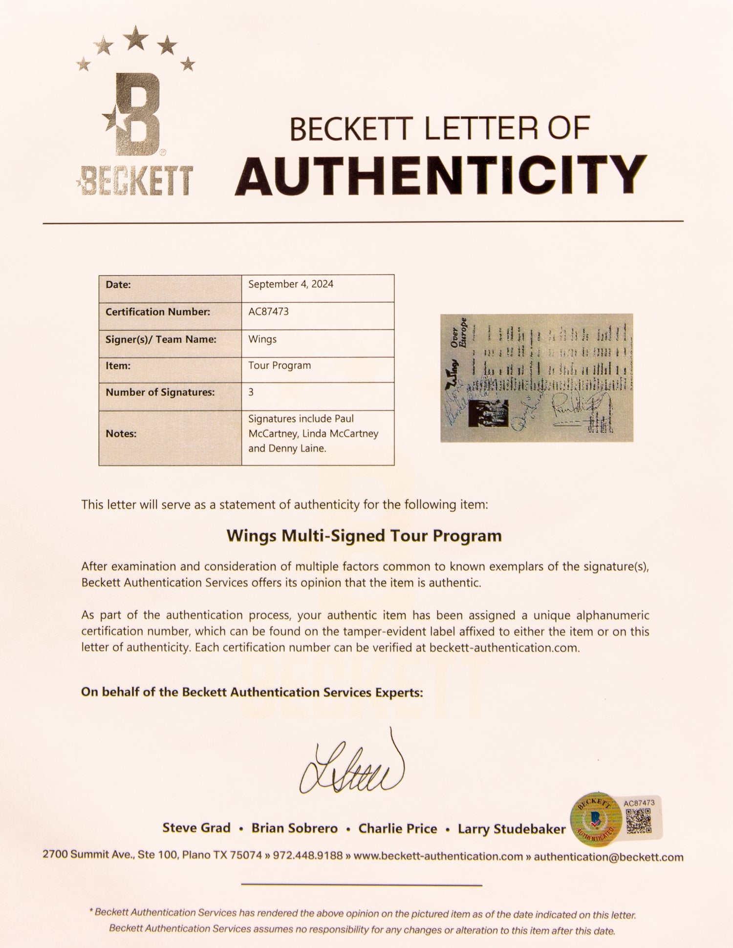 (3) Linda & Paul McCartney, Denny Lane Signed Wings Over Europe Tour Program BAS is backordered and will ship as soon as it is back in stock.