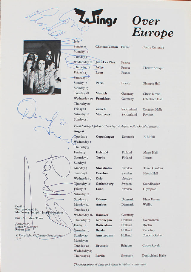 This rare and collectible Autographed 1972 Wings Over Europe Tour Program has been personally signed by Paul McCartney, Linda McCartney, and Denny Laine of Wings, making it a must-have piece for any fan of classic rock and Beatles memorabilia. Celebrating the legendary Wings' first major European tour following Paul McCartney's departure from The Beatles, this original tour program captures a defining moment in pop culture history. Its authenticity and exceptional provenance make it an extraordinary investment for serious collectors.