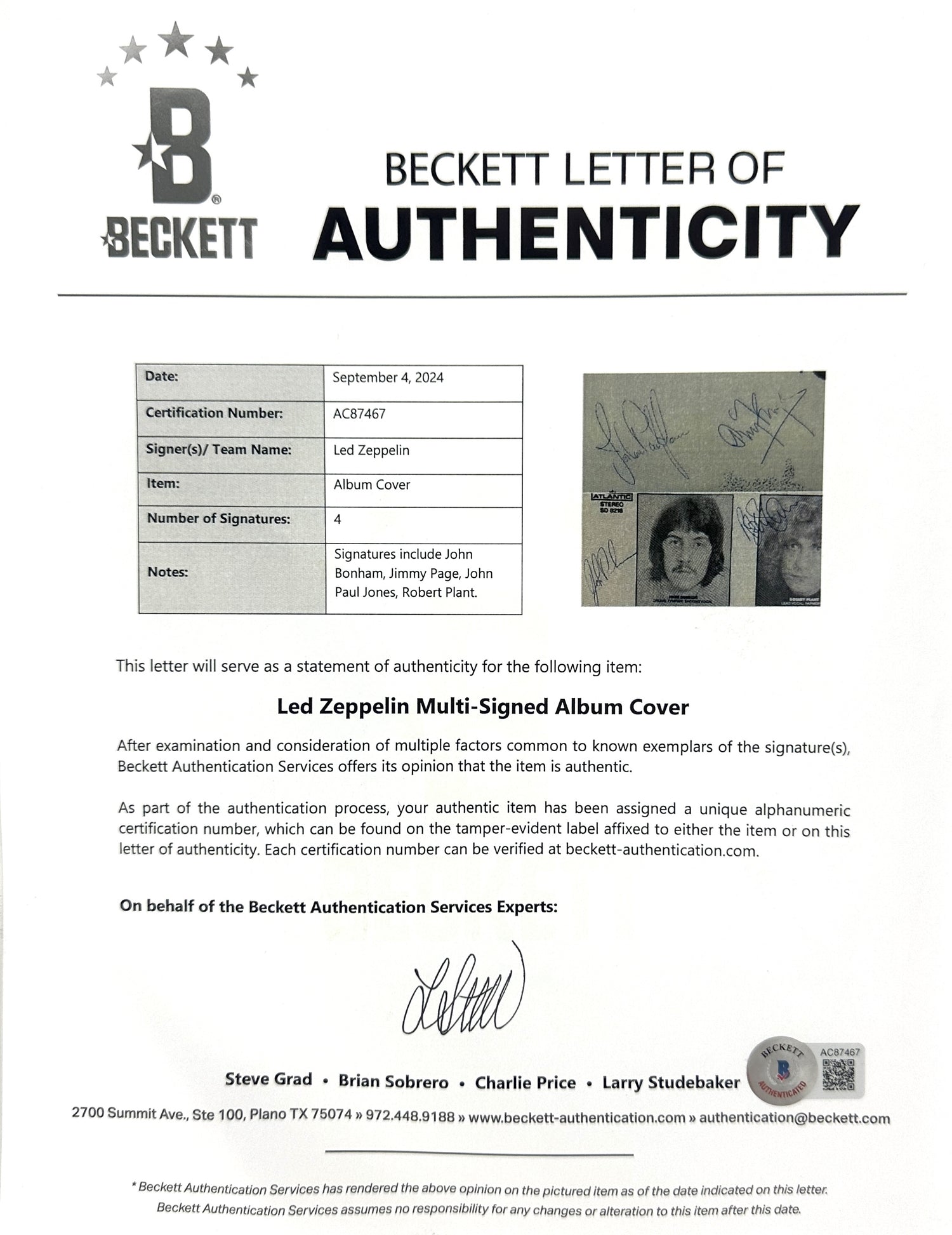 Whether you're a lifelong Led Zeppelin fan or a passionate memorabilia collector, this autographed album is a timeless tribute to one of rock’s most influential bands. Secure this iconic piece today!