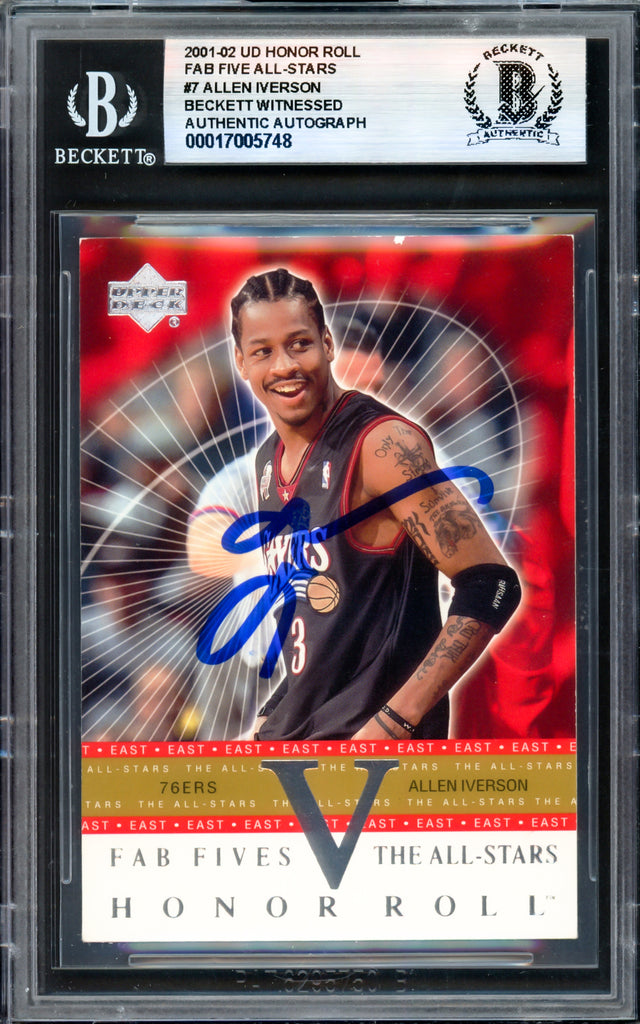 Allen Iverson Autographed 2001-02 Upper Deck Honor Roll Fab Five All-Stars Card #7 Philadelphia 76ers Beckett BAS Witness #17005748
