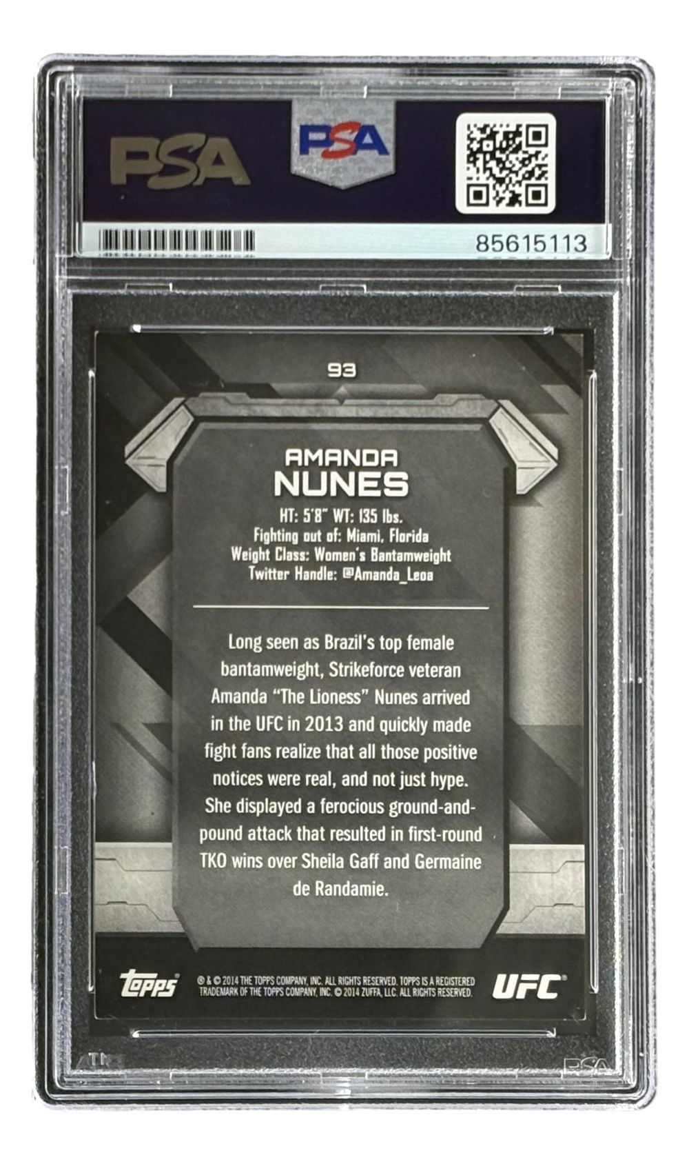 Own a piece of MMA history with this Amanda Nunes signed 2014 Topps #93 trading card. Widely respected as one of the greatest female fighters in UFC history, Amanda Nunes made her mark on combat sports with her dominance in both the bantamweight and featherweight divisions. This collectible card captures her early career and has been personally hand-signed by Amanda Nunes, making it a valuable addition for any serious MMA or sports memorabilia collector. Professionally authenticated and encapsulated by PSA, this card offers both authenticity and protection for long-term display and investment value.
