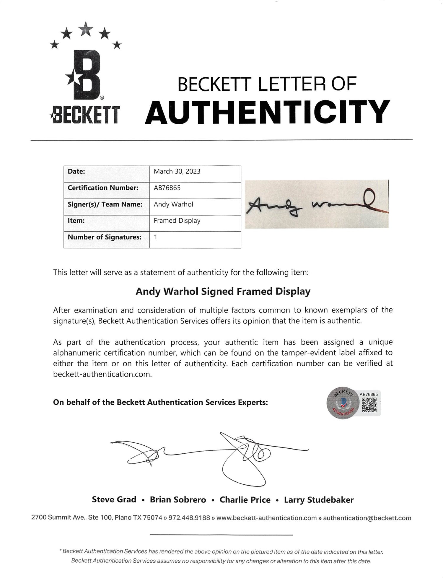 - A Timeless Collector’s Piece – A must-have for admirers of Andy Warhol, this autographed and framed signature makes for an impressive addition to any art or memorabilia collection.