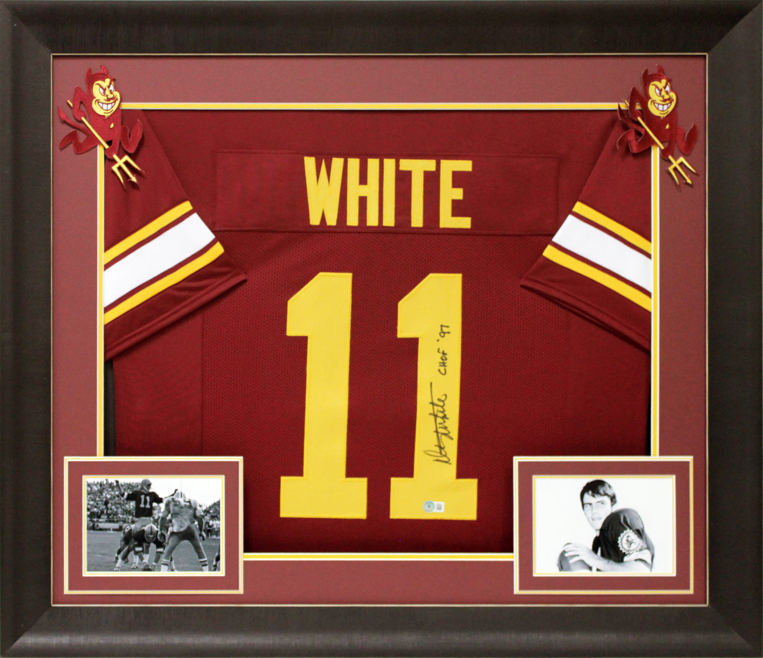 Celebrate the legacy of Arizona State Sun Devils legend Danny White with this stunning Autographed Maroon Pro Style Framed Jersey inscribed with "CHOF '97". A must-have for Sun Devils fans and serious sports memorabilia collectors, this custom-stitched, professionally framed jersey honors the iconic quarterback and 1997 College Football Hall of Fame inductee in striking style. Personally signed by Danny White, this piece is authenticated by Beckett Authentication Services (BAS) through their Witnessed Protection Program—meaning a BAS representative was present at the signing to ensure maximum authenticity. This eye-catching relic captures not just a signature, but a significant moment in Arizona State football history. Danny White led the Sun Devils to a perfect season in 1975 and is remembered as one of the most accomplished quarterbacks in program history. Now you can own a piece of that legacy, secured with trusted authentication and framed to stand out in any fan cave.