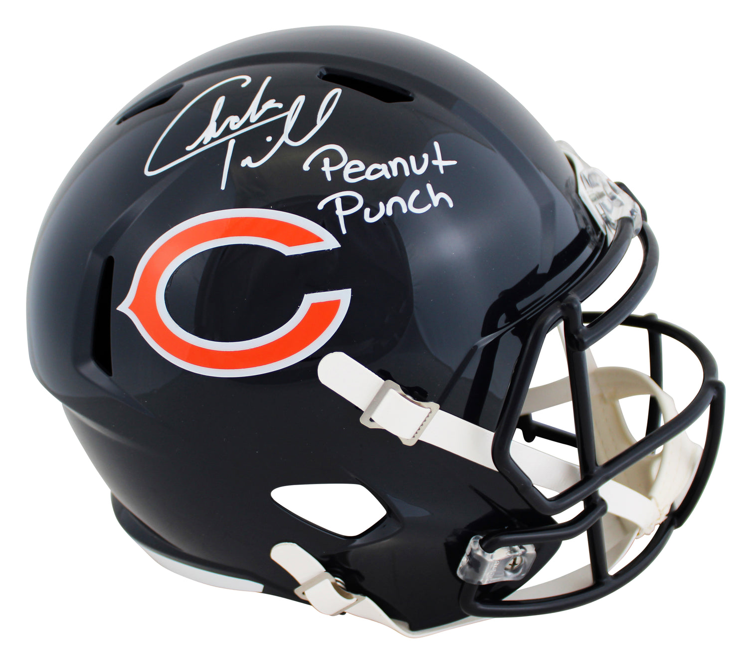 Own a piece of Chicago Bears history with this Autographed Riddell Full Size Speed Replica Helmet, personally signed by iconic cornerback Charles Tillman, fondly nicknamed “Peanut.” This collectible not only features Tillman’s authentic autograph, but also includes his famed defensive mantra “Peanut Punch” as an inscription—paying tribute to the turnover-forcing technique that made him a legend on the field. Housed in a premium UV mirrored back acrylic display case, this helmet is a striking centerpiece for any authentic NFL memorabilia collection.