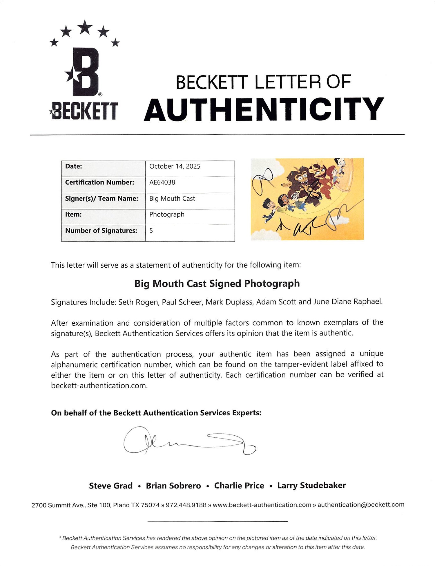 This rare Autographed 11x14 Photo is personally signed by comedy icons Seth Rogen, Paul Scheer, Mark Duplass, Adam Scott, and June Diane Raphael, stars of the hit animated Netflix series Big Mouth. A must-have collectible for fans of comedic television and pop culture, this signed photo captures the spirit of one of the most influential adult animated comedies of our time. Whether you're a dedicated memorabilia collector or a Big Mouth superfan, this signed piece offers a conversation-starting display item loaded with star power and authenticity.