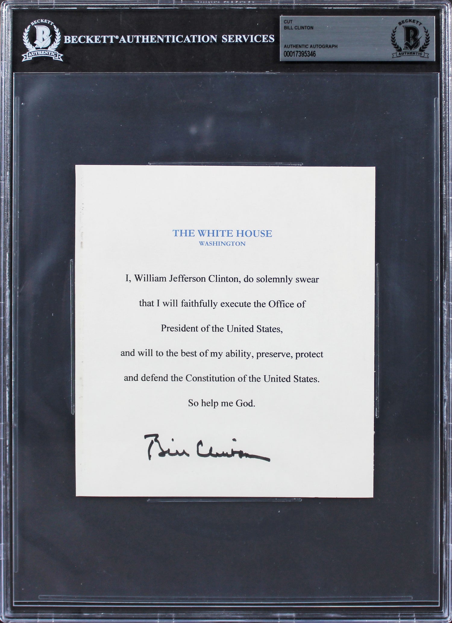 Own a piece of American history with this Bill Clinton Autographed 5.75x6.25 Oath of Office Cut Signature. A must-have for political memorabilia collectors, this rare item features the authentic signature of the 42nd President of the United States, adding prestige to any collection. This signature is 100% authentic, professionally slabbed and authenticated by Beckett Authentication Services (BAS), ensuring its legitimacy.