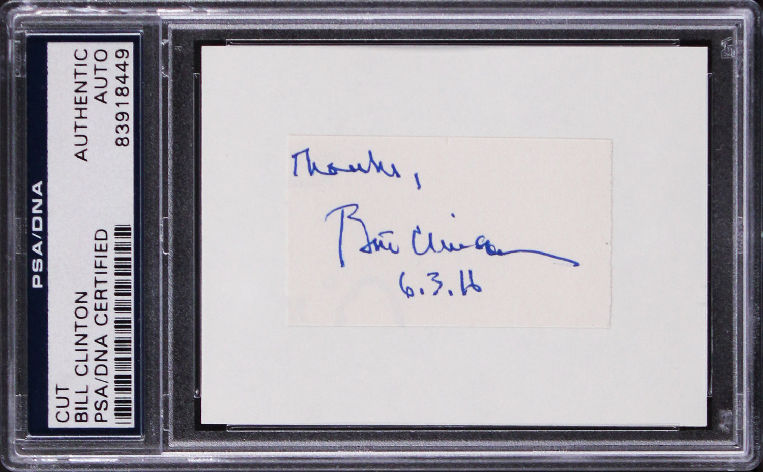 Bill Clinton "Thanks" Authentic Signed 1.25x2.25 Cut Signature PSA/DNA Slabbed