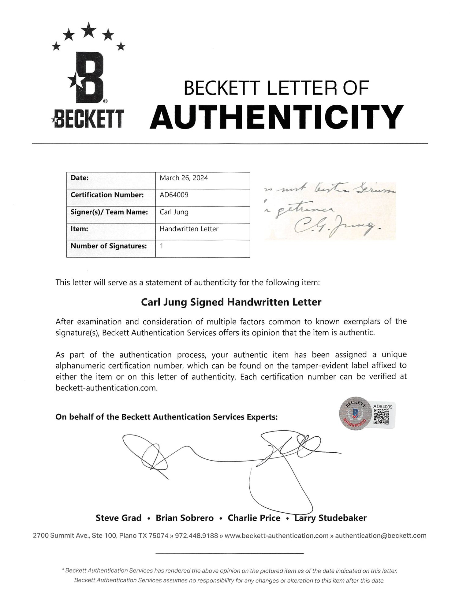 Own a rare piece of history with this Autographed 8.25x11.5 1949 Handwritten Letter, personally signed by Carl Jung, one of the most influential psychologists of all time. This remarkable document offers a tangible connection to Jung’s groundbreaking contributions to analytical psychology.