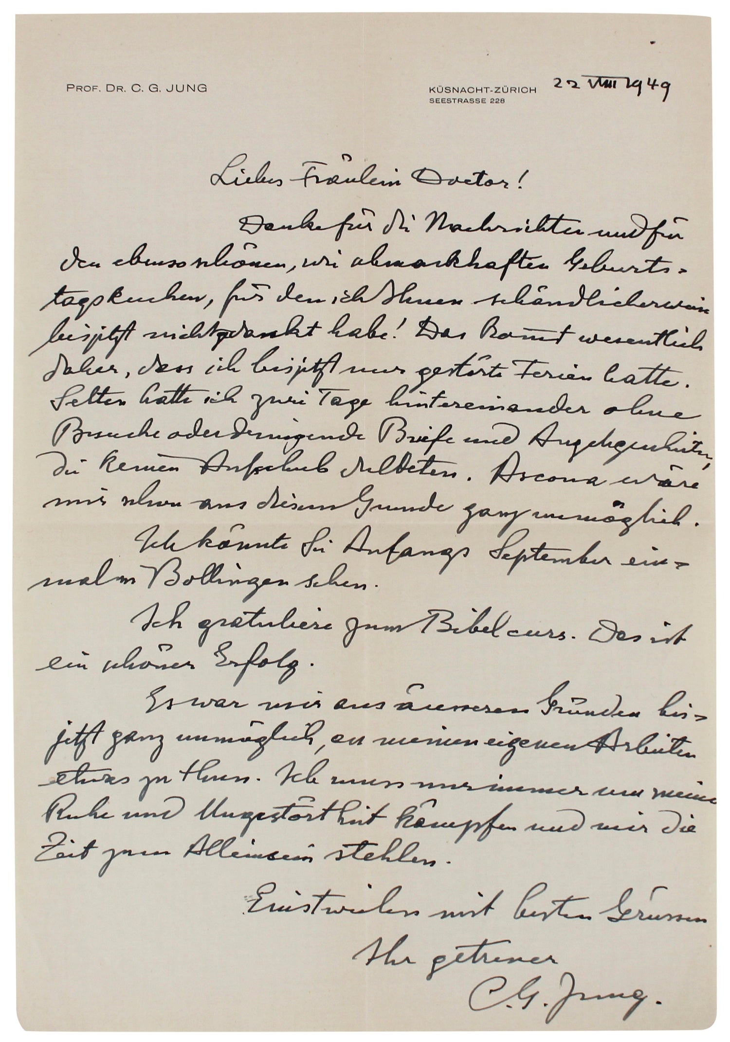 Carl Jung Authentic Signed 8.25x11.5 1949 Handwritten Letter BAS #AD64009