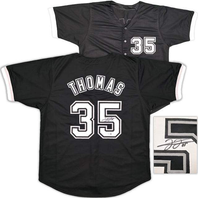 Own a piece of baseball history with this stunning Frank Thomas signed Black Jersey. A must-have for any dedicated fan or memorabilia collector, this custom jersey prominently features sewn-in name and numbers for a high-quality, authentic look. Perfect for display or as a standout addition to your sports collection, this jersey celebrates the legacy of one of baseball’s greatest hitters.