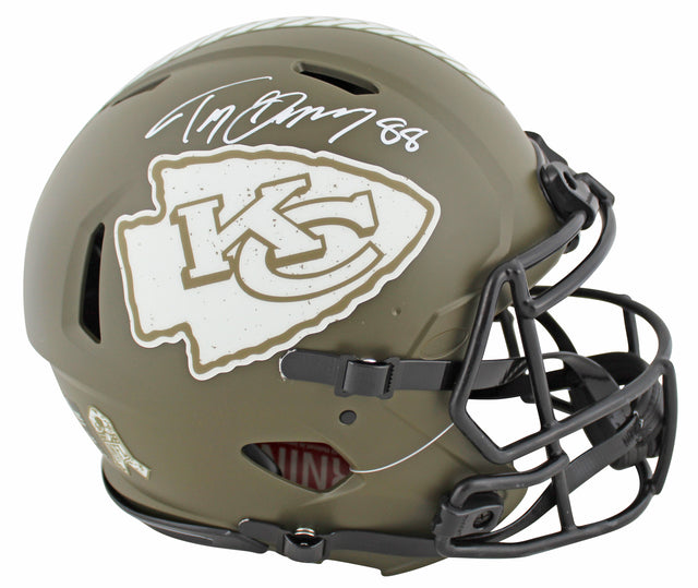 Own a piece of Kansas City Chiefs history with this Autographed Alternate Salute to Service Riddell Authentic Full-Size Speed Proline Helmet, personally signed by legendary tight end Tony Gonzalez. This exclusive collectible is a must-have for devoted Chiefs fans and memorabilia enthusiasts alike.